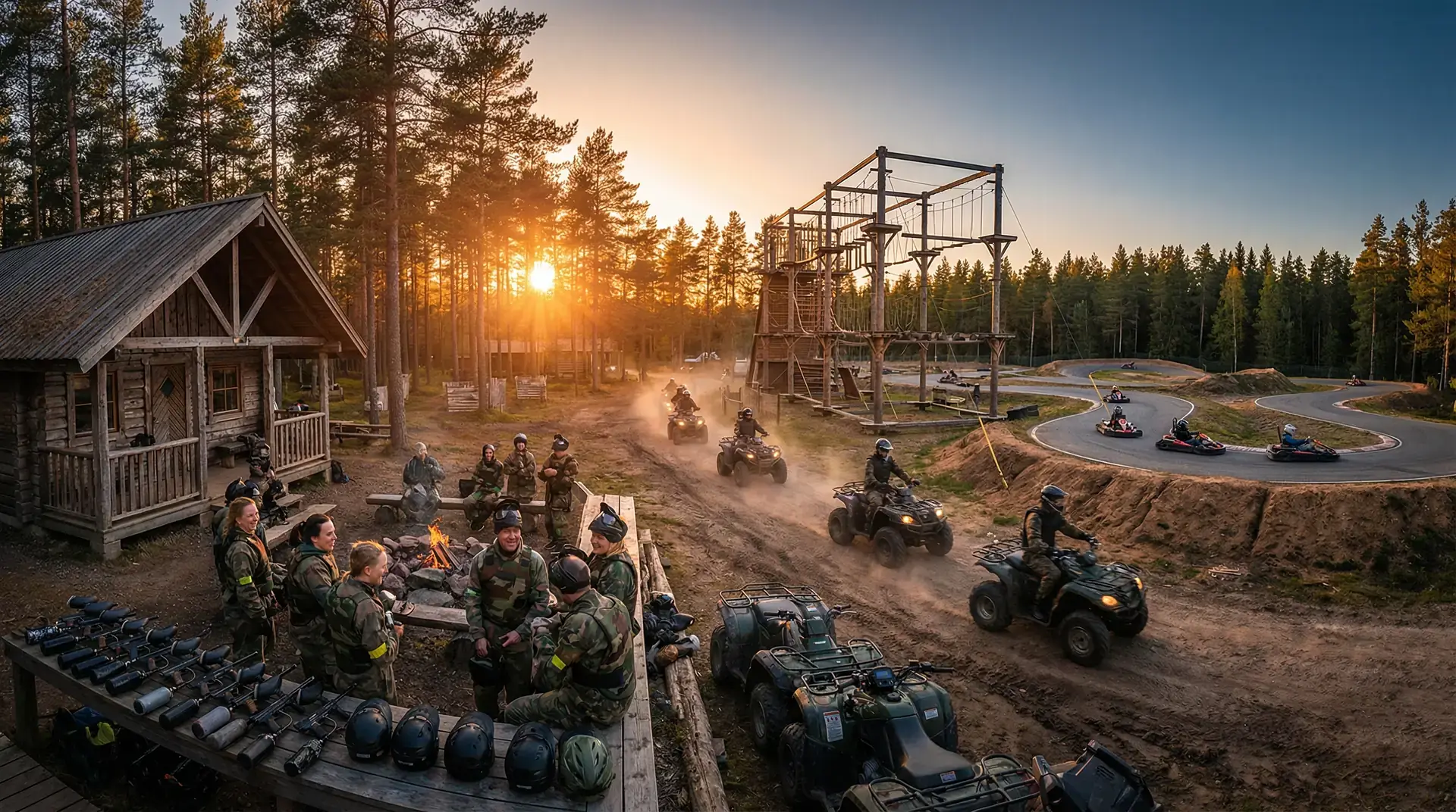 - Allt på ett ställe. Paintball, gokart, fyrhjuling och femkamp samlade på samma anläggning. Ni slipper köra mellan olika platser och kan mixa aktiviteter fritt.